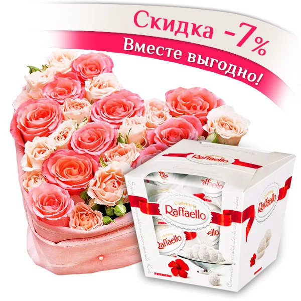 Сердце розы - композиция из розовых роз + конфеты "Raffaello"