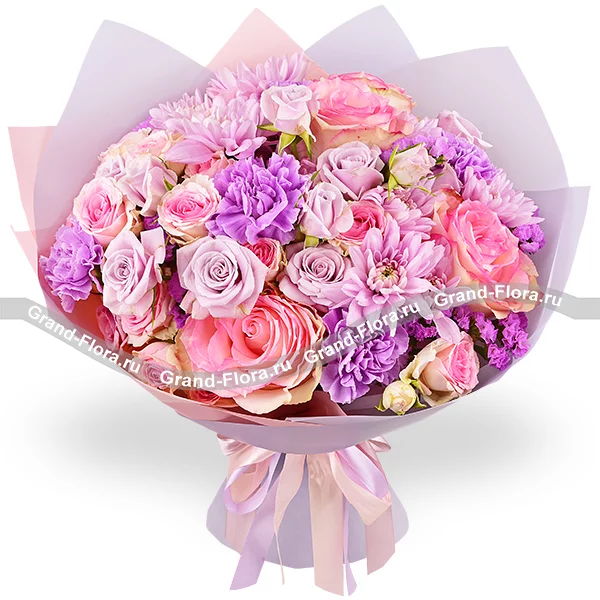 Букет выполнен из роз нежно – розовых и фиолетовых оттенков, кустовой хризантемы сиреневого оттенка и гвоздики в тон композиции, финальные аккорды статицы, в окружении невесомого розово – фиолетового фетра и ленты, завершают букет, делая его изысканным и элегантным. Букет составляет от 30см в высоту, а диаметр от 20см до 35см, в зависимости от выбранного Вами варианта. Обращаем Ваше внимание, что состав и оформление букета могут отличаться.