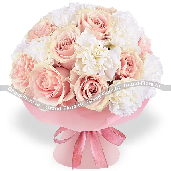 Аромат счастья – букет с розовыми розами и белыми гвоздиками